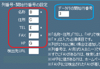 ※最低限、「名称」「TEL」「FAX」のヘッダの列番号(赤枠のところ)とデータの開始位置(青枠のところ)を入力してください。