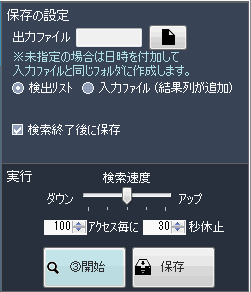 を押下すると、検索が開始されます。検索終了後は、指定のファイル名でファイル出力が行われます。