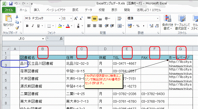 ※FAX列がない場合はあらかじめエクセル表に追加しておく必要があります。