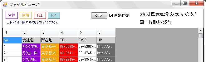 ※「名称」「住所」「TEL」「HP」の順にヘッダ(色枠のところ)をクリックして行きます