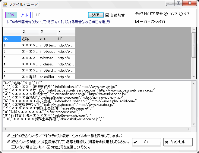 IDXは一意に識別できる「行番号」や「社名」、「電話番号」を必要に応じて指定してください。