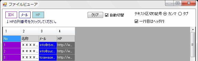 ※「IDX(インデックス)」「メール」「HP」の順にヘッダ(色枠のところ)をクリックして行きます。